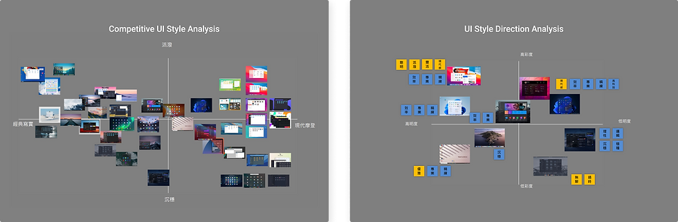 In order to understand the UI design trend of the operating system, we collected all relevant images from all over the market. Then, I used the cross-analysis method for classification, observing and understanding the elements that cause differences in style. Based on this, we summarized the effects we hope to present. It can be seen that the latest Windows 11 and Mac are both leaning towards modern style, using geometric abstract elements and more intense colour schemes.